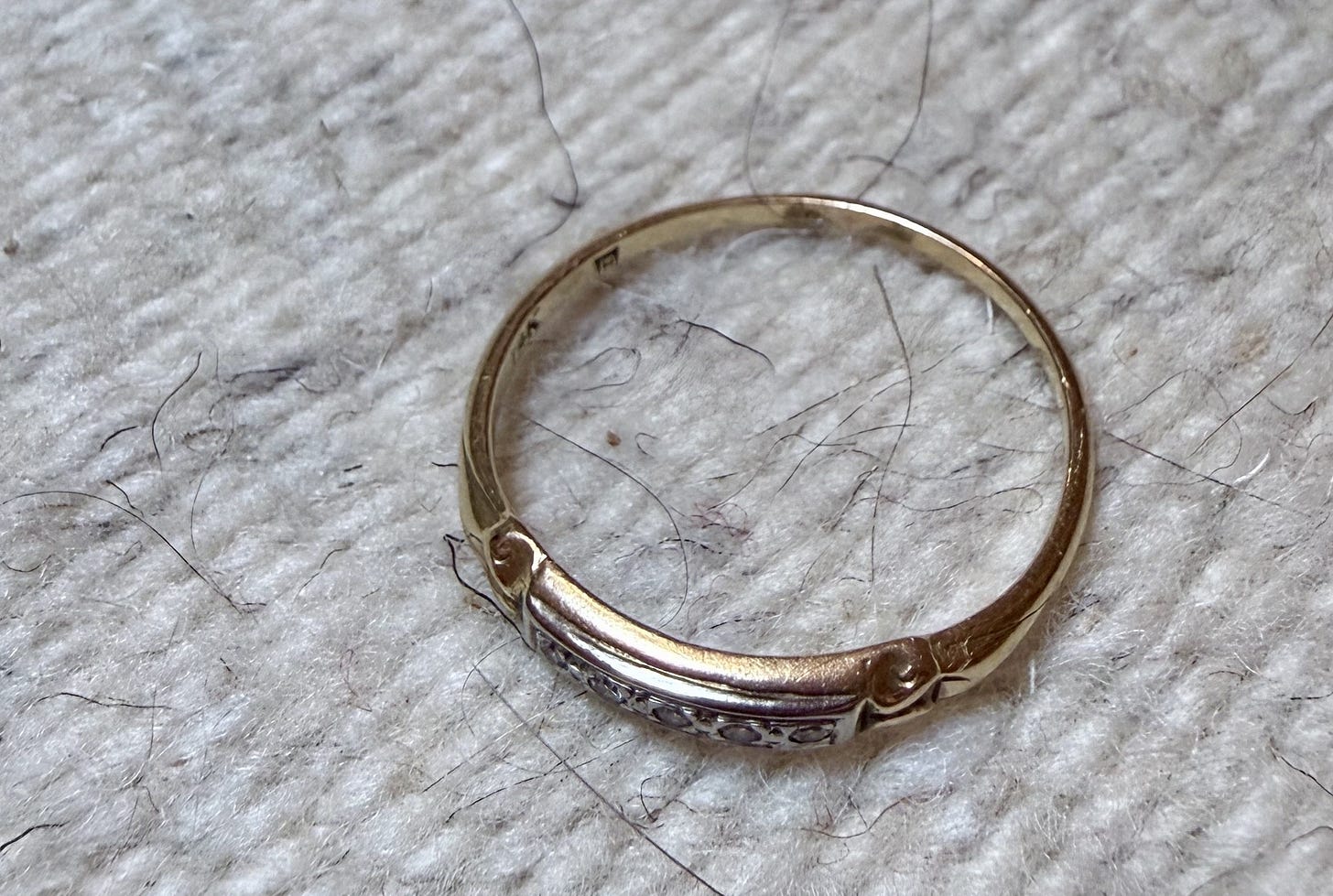 FIRST RING: The smallest is a ring with six tiny diamonds and was passed down without a name. This woman was small, perhaps my great aunt Carrie. She was about five feet tall, but a forceful woman, one of 12 children who put many nephews and nieces through college training programs, moving a generation forward in the world. Or maybe it is a child’s ring, a gift from a doting parent, my grandmother had doting parents. This ring has no clues, it stays a mystery.