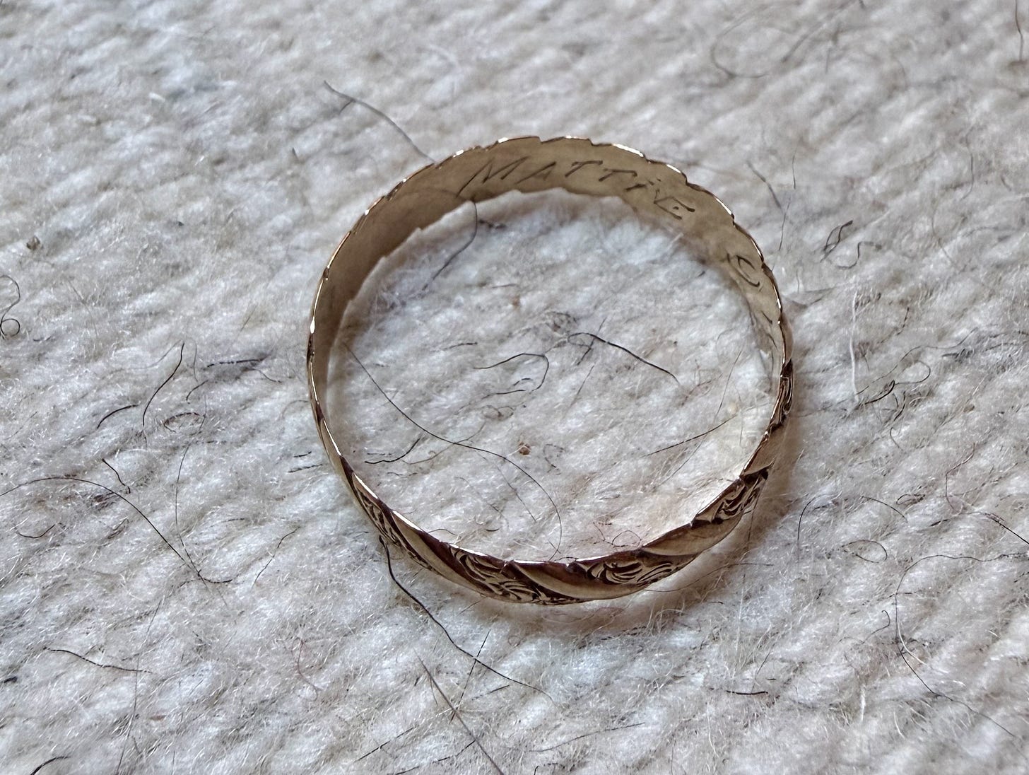 I can verify that John and Martha were married for 45 years and had seven children, and I am a direct descendent of one of them, Jonathan.2 I can’t verify that John called Martha, his Mattie, or that this was the wedding ring she wore for 45 years but it makes their lives more real to imagine it that way as I hold that gold ring in my hand.