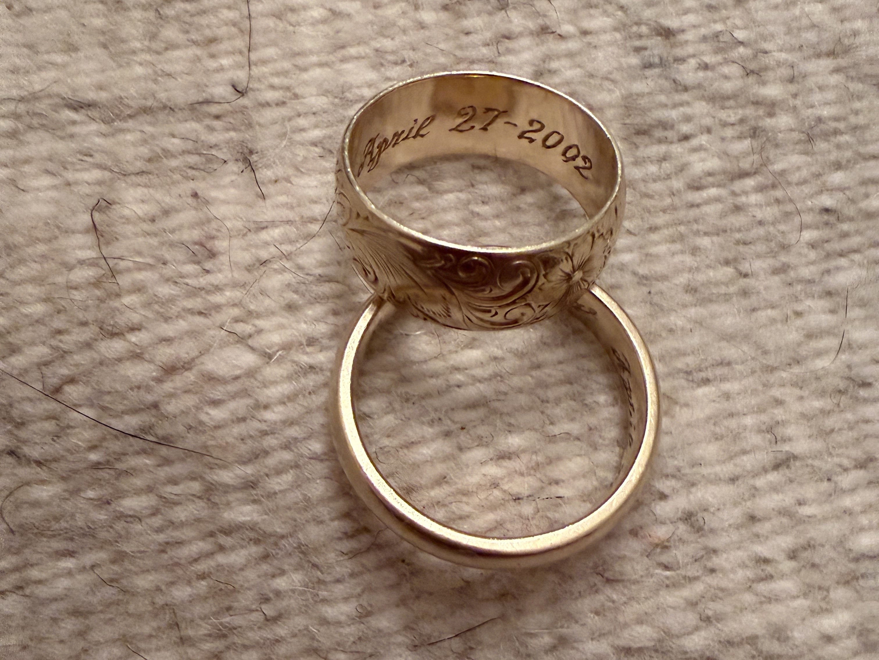 THIRD and FOURTH RINGS: The wide gold ring is my wedding band given to me by my husband Bernie. We came to marriage with grown and almost grown children. The gold ring is etched with flowers and one small heart. The shiny gold wedding band is Bernie’s ring, he wore it faithfully until he passed away in 2016. Older, battle scarred and wiser, we took on the challenge of living together with grace and learned lessons along the way. I know many good stories grounded and bound to these two rings.