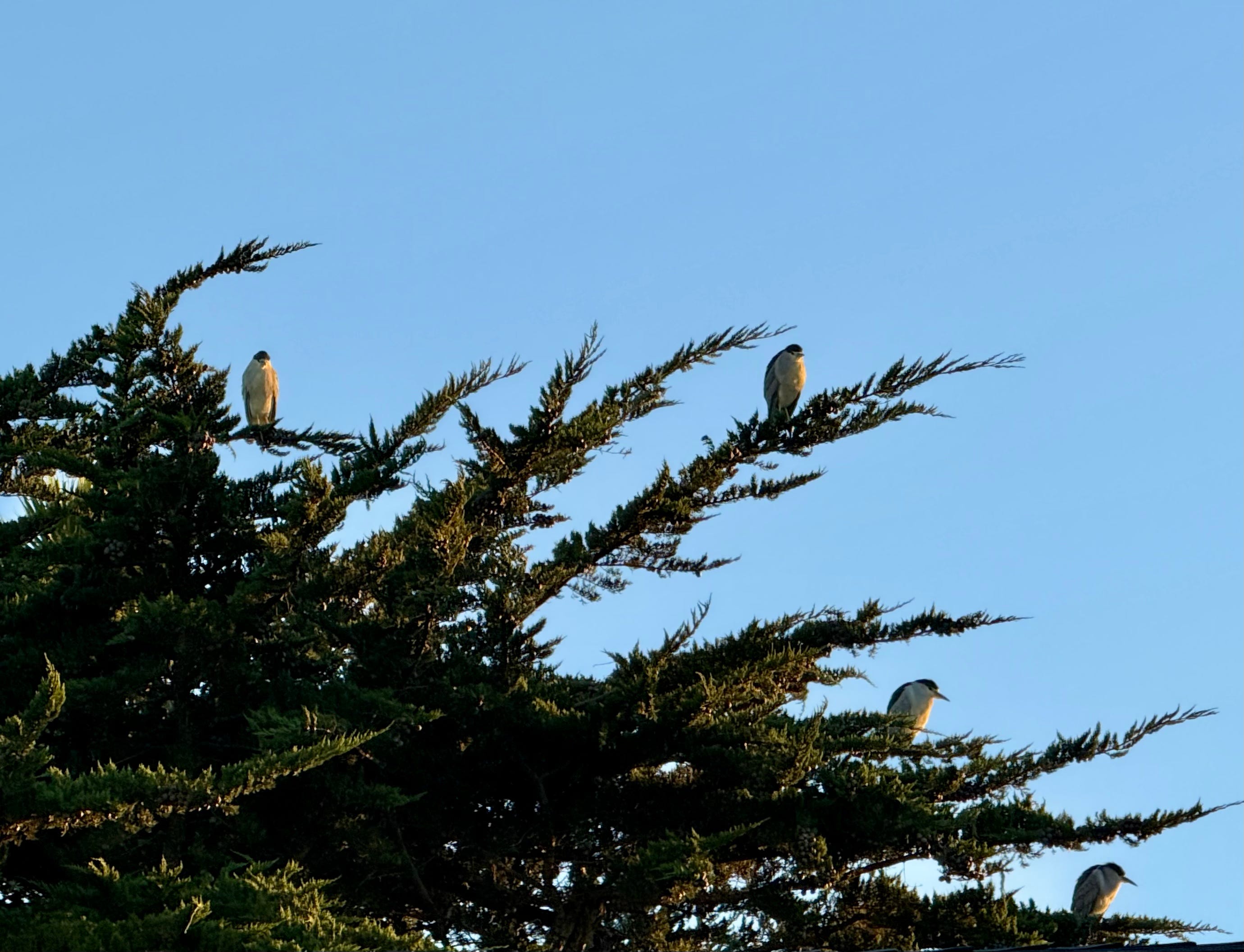 Just after sunrise, I was watching birds on the shoreline and I saw four good sized birds land nearby in a cypress, as if returning to assigned seating in the tree with raspy scolds. Their postures identified them as herons and with the binoculars I could see the coloring of Black-crowned Night Herons including the black caps on their heads. The behaviors of the four birds also matched their social habit of colonial rookeries.
